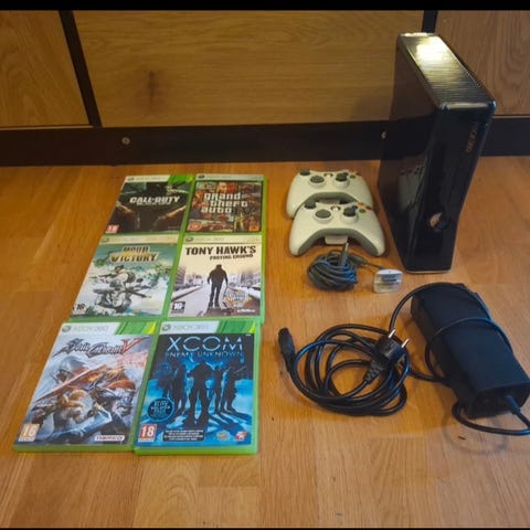 Microsoft Xbox 360 spillkonsoll med 120GB harddisk. Konsollen er svart og har trådløs nettverksantenne. Strømadapter følger med.