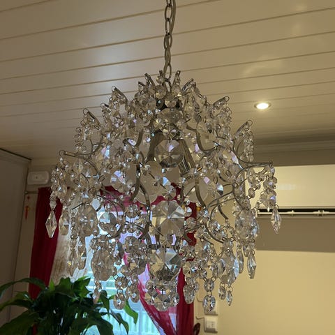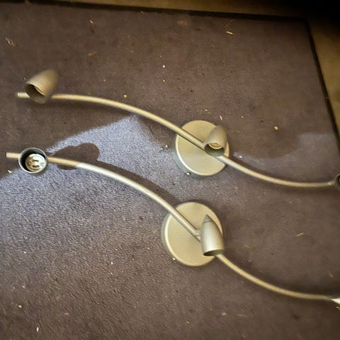 Tre stk taklamper i blankt metall med tre stk spott pærer på hver.