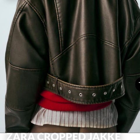 Zara XL jakke i svart farge. Jakken har glidelåslommer og en asymmetrisk glidelås foran. Materialet har en tekstur som minner om skinn, med en myk, pelslignende fôr og krage.