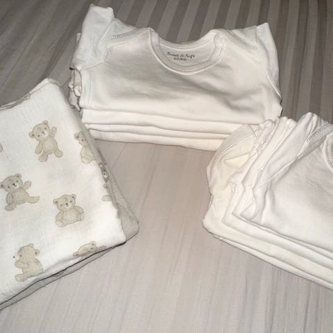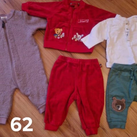 Barneklær for gutt i størrelse 62 med flerfarget design. Inneholder ulike plagg i forskjellige farger og mønstre, egnet for barn i alderen1-6 måneder.
