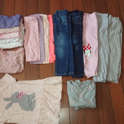 Hettegenser fra Gap, en rosa joggebukse, to pysjamaser fra Lindex med 2-veis glidelås og en blå tights.