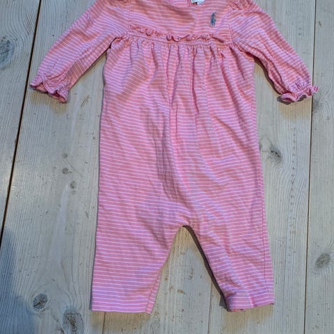 Coverall / jumpsuit for jente i rosa med hvite striper og blondekrage. Åpning i siden. Størrelse 9M