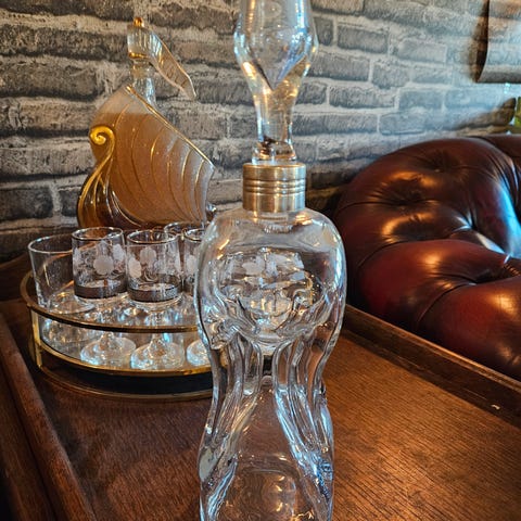 2 stk vikingeskip selges samlet for kr 600. Begge flaskene er pent brukt og det er ingen synlige skader/skår i glassene- se bilder. Korken på en av flaskene er smuldret bort.