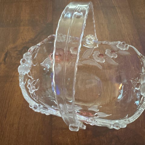 Glasskurv med håndtak, dekorert med utskårne og fargede blomster i rose og klart glass. Kurven har en rund form med bølgete kant og et buet håndtak. Egnet som dekorativt element eller til oppbevaring av små gjenstander.
