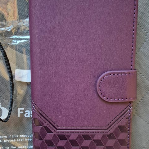 Apple telefondeksler i lilla farge, laget av en kombinasjon av TPU og lærmateriale. Dekslene inkluderer en TPU-innsats for beskyttelse av telefonen og et ytre lærdeksel med kortholder og lukking. Designet for å beskytte telefonen samtidig som det gir praktisk oppbevaring av kort og kontanter.
