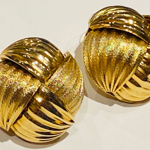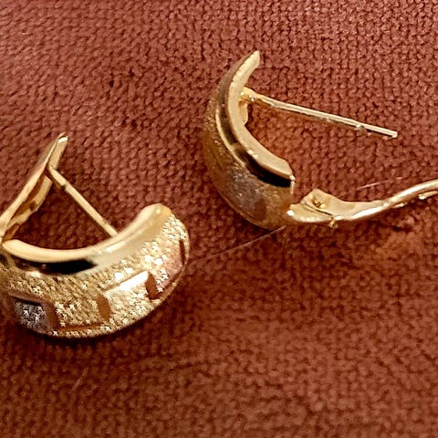 Gullfargede halvsirkelformede øredobber laget av metall med teksturert overflate.