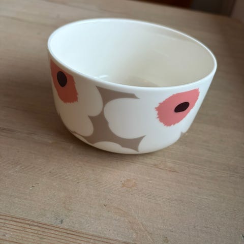 Marimekko melaminservise, 4 tallerkener, 1 bolle og 1 stor salatbolle (gratis). Selges samlet. Salatbollen har riper, derfor er den gratis. Resten er i god stand.