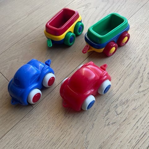 Kjører fremover når man presser ned hodet på lekene. Toget og lastebilen fungerer, flyet sitter fast.