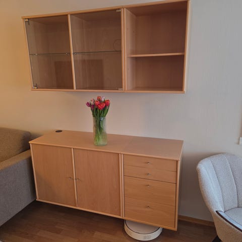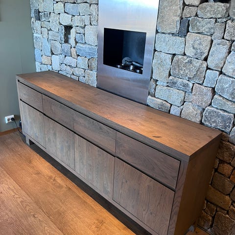 Selger meget pent brukt høykvalitets skjenk fra norsk produsent Aannø som ble nedlagt i 2019. Skjenken har ingen skader eller merker utvendig, men har en liten ripe på platen under den øverste platen som er usynlig. Det er to spotter over glass seksjoner som lager koselig stemning på kveldstid. Seksjonene er romslige og praktiske.