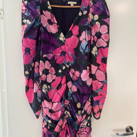 Blomstrete festkjole. Puffete lange ermer og v/-utringning. Drapering over mage og bak som gir en fin silhuett. Den er tettsittende nedentil og litt løsere stil på overdelen. Den har glidelås bak. Den er M/38 og har stretch fra stikk i draperingen som former mage og rumpe.