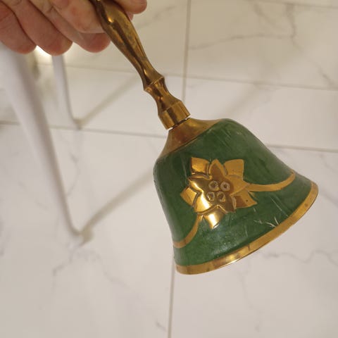 Sjarmerende messingklokke. Dekorativ i vindu til jul med det røde silkebåndet. Den er noe eldre men ikke gammel.