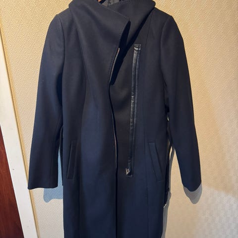 Grå Esprit kåpe i 50% ull med detaljer i sort kunstskinn, trykknapper og belte. Kragen er høy og beskytter godt mot kulde og vind. Pyntelommer foran (ikke funksjonelle lommer). Størrelse 38/medium, normal i størrelsen.