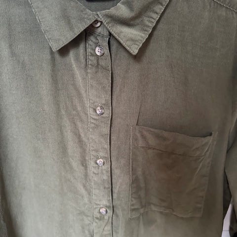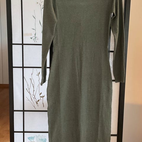 Kort kjole med lange ermer i en mørk gammelrosa/lyngfarge størrelse medium. Lukkes med skjult glidelås i siden og en knapp i nakken. Mykt babycord-aktig stoff. Kjolen er kun prøvd på, men ble litt kort for meg. Kjempeflott farge og stoff til høst/vinter!