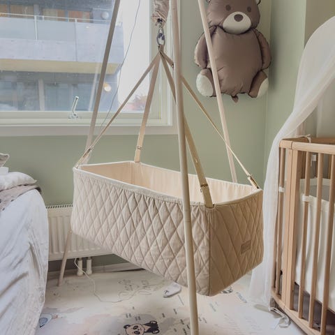 Jollyroom Vugge barneseng designet for barn. Den har en ramme i metall og stoff i grå farge. Egnet for bruk som en trygg og komfortabel soveplass for spedbarn.