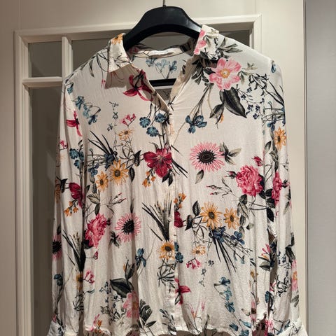 Bik Bok Bluse i størrelse L med flerfarget blomsterprint. Blusen har lange ermer, krage og knappestolpe foran. Materialet er lett og semitransparent.