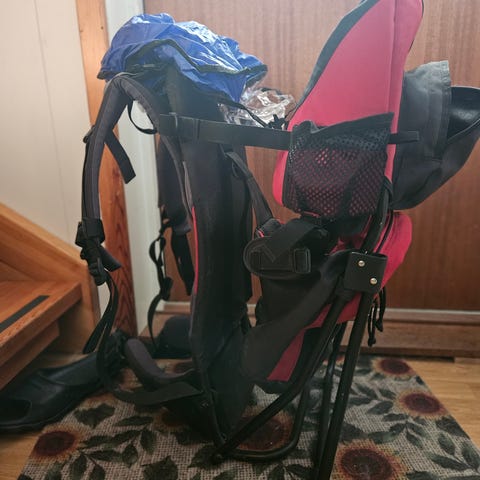 Svært solid og lett bæremeis. Regntrekk følger med. Liten tursekk kan kobles av og på med glidelås. Stort rom i bunnen til turutstyr. Man kan ta ut et lite telt fra ryggen som beskytter barnet mot vær, vind og sol. Regntrekket kan videre monteres utenpå teltet om ønskelig. Brukt mye og hatt svært stor glede av dette kvalitetsproduktet.