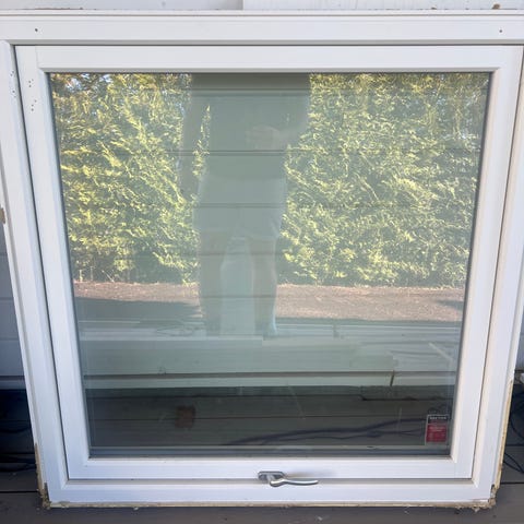 Ukjent merke vindu i hvitt tre med mål 109x109cm. utvendig karmmål. Topphenslet og kan vendes helt rundt. Ventilrist sitter utvendig. Hvitmalt og ingen råte. Vinduet har klart glass og er egnet for montering i bolig eller hytte. Passer for standard vindusåpninger med tilsvarende dimensjoner. Har vært montert på ett gjesterom som har vært lite brukt.