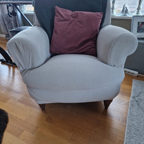 Nett liten puff som passer godt til å gjemme leker eller sy-strikkesaker i. kan også brukes som ekstra sitte plass. Må trekkes om utvendig , innsiden ren og pen . Står på 4 runde tynne bein som kan tas bort om man ønsker.