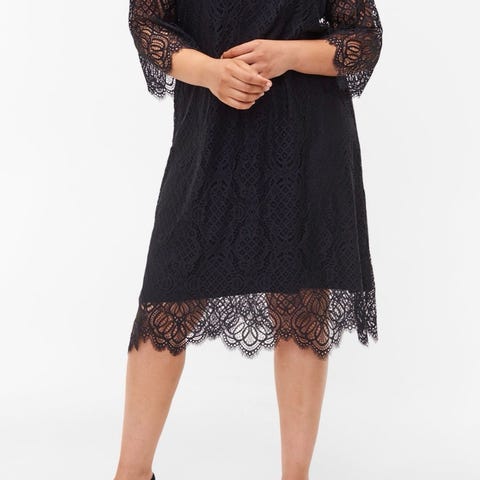 Zizzi festkjole i svart farge, størrelse 44 for kvinner. Kjolen har en overdel med blonder og en plissert skjørtedel. Egnet som festkjole for formelle anledninger.
