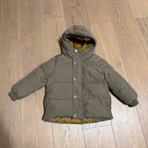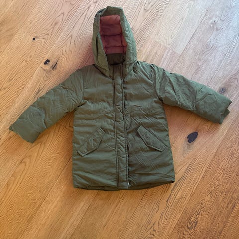 H&M barn jakke i størrelse 110, grønn farge. Jakken er unisex og egnet for barn. Den har hette og er foret med rosa fôr. Materialet er designet for å gi varme og komfort.