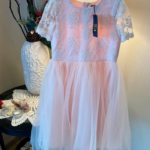 Til jul? Selges nydelig Hvit «Nyshi, especially for you» penkjole, festkjole, selskapskjole, brudepikekjole med tyll, brukt en gang i str. 134, 9 år for 299kr. For info se bilder😊