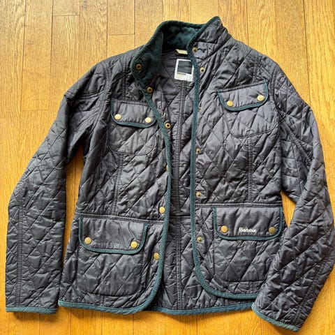 Barbour Quilted Jakke i blå farge, størrelse 38 for kvinner. Jakken har quiltet mønster, glidelås og knapper foran, samt lommer med glidelås. Materialet er designet for yttertøy med vekt på komfort og funksjonalitet