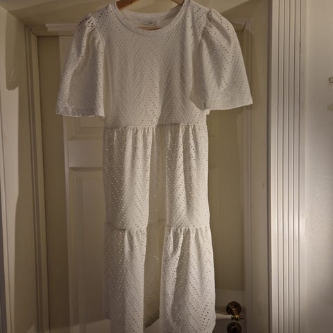 Str L i wow, tilsvarer nok ca 10-11 år. Nydelige detaljer/perler i stoffet. Vakre åpninger på overarmen og på ryggen.