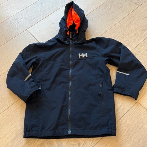 Helly Hansen skalljakke i str. 122/7, marineblå med oransje detaljer. Modellen er Shelter Jacket 2.0, kjent for å være vindtett, vannavstøtende og pustende.