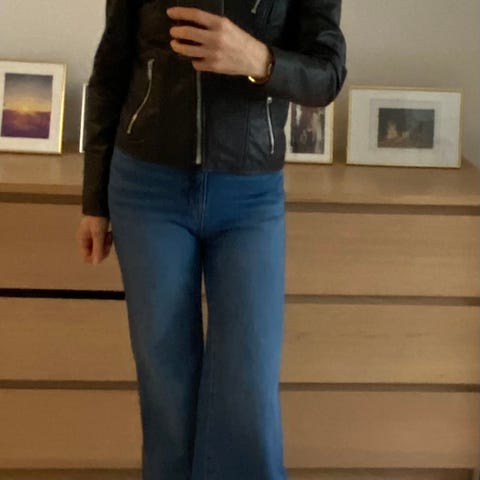 Marie Philippe skinnjakke for kvinner i størrelse S. Jakken er blå og laget av semsket materiale. Den har glidelås og knappedetaljer, egnet for hverdagsbruk. Har blitt noe blassere i fargen med årene, men ser fortsatt kul ut.