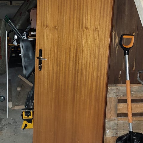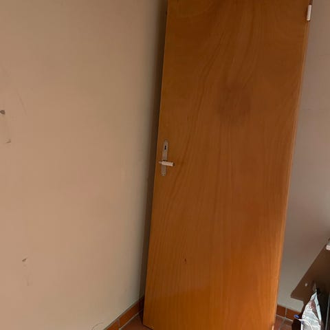 Dør som var montert til baderom ved overtakelse. Skruer og hull på ene siden, hang et speil på skruene som skjulte hullene. Låsemekanismen medfølger.