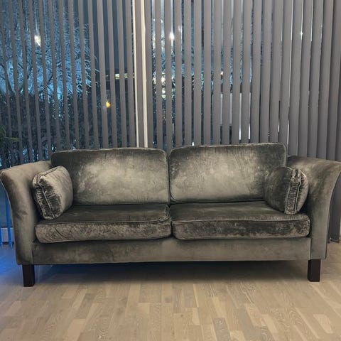 Sofaen har veldig god sittekomfort med avtagbare trekk som kan vaskes i maskin. Putene er ikke nedsittet, men stoffet har noe synlig slitasje på enkelte puter. Sofaen har fine metallben og passer i de fleste stuer. Kjøpt på Krosby møbler.