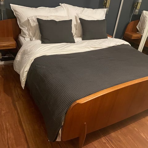 Sengen har flotte detaljer med bl.a avrundede kanter i massiv teak.