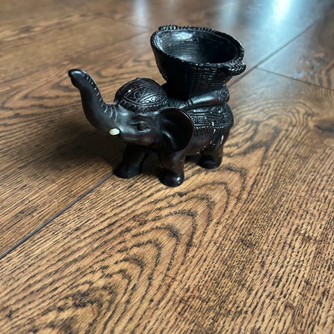 Elefanten er formet, modellert og glasert for hånd – med den karakteristiske sprøyteglasuren i bruntoner med varme roséskygger i ørene, som var typisk for norsk keramikk i midten av 1900-tallet.