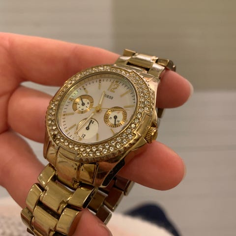 Klokken er tung og solid i kvaliteten. Pent brukt, med små bruksmerker som forekommer ved normal bruk. Gullfarget med skive i perlemor, og strass rundt uret ✨