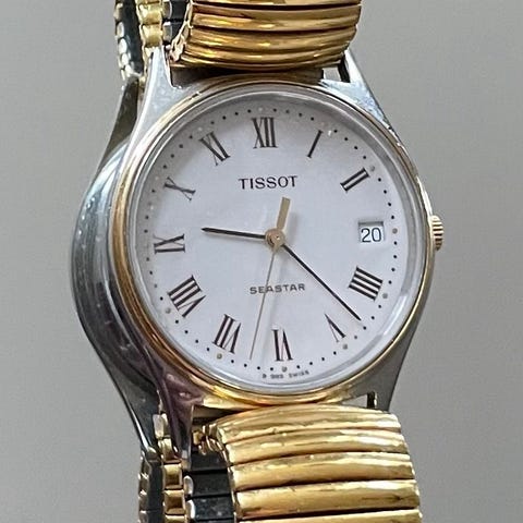 Certina herreklokke med to-tonet rustfritt stålarmbånd og urskive i gull- og sølvtoner. Klokken har datovisning og analog urskive med gullfargede visere og markører. Bakdekselet viser Certina-logo og årstallet 1888.