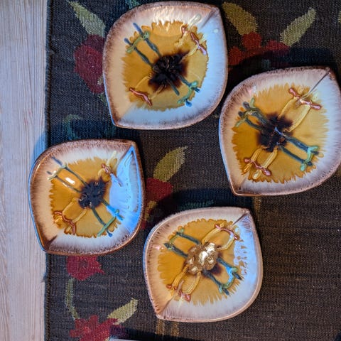Nydelig stort dekorfat i keramikk, håndmalt med gule blomster og brun bladdekor. Retro / mid century uttrykk.