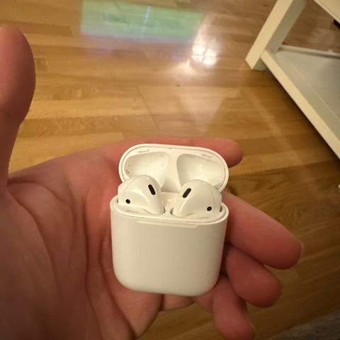 Selger AirPods 1.gen hvor etui følger med. De fungerer godt for musikk, men mikrofonen er litt ustabil. De kan derfor gå litt av og på under telefonsamtaler.