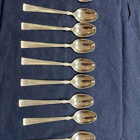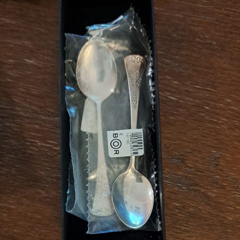 Deler i Arvesølv selges under halv pris av nypris. 8 te/ kaffeskjeer 11,5 cm, nypris 550, selges kr 250 pr stk. 1 gaffel 17 cm, ny 1530, kr700. 2 kakespader, 20,5 cm, ny 2600, 1000 pr stk. 1 paikniv 27 cm, ny 1700, 800 Alt lite og pent brukt