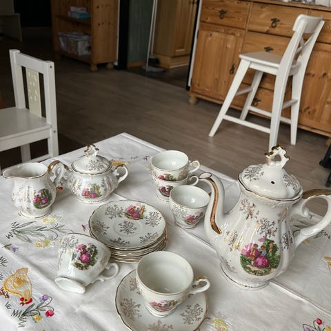 Koppestell i porselen med blomster og gullrand, barnesett, originalt fra midten av 1980-tallet.