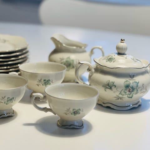 Fire kopper (med tefat), en kanne med lokk, en fløtemugge og en sukkerskål. I meget god stand.