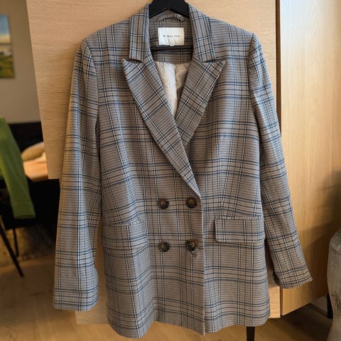 Blazeren har dobbelspent knappelukking og lommer, mens skjørtet er kort med rette linjer. Settet er laget av et stoff med rutemønster i nøytrale farger og passer til formelle eller uformelle anledninger.