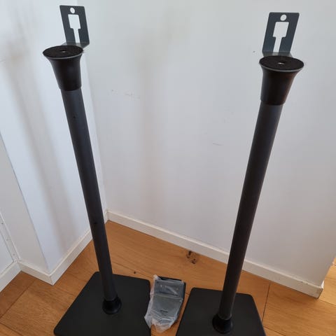 Sonos høyttalerstativ i svart farge. Designet for å støtte Sonos høyttalere og sikre stabil plassering. Laget av metall med en svart finish.