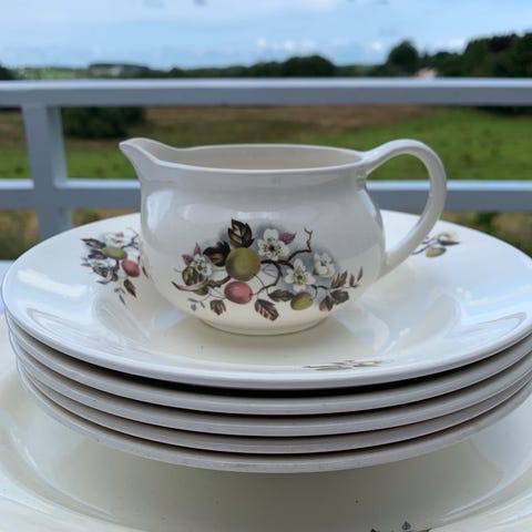 Dette er en vintage suppebolle i Fire King Peach Lusterware-stil med bikube, håndtak og lokk. Den ble produsert av Anchor Hocking, sannsynligvis på 1950- eller 1960-tallet. Bollen er kjent for sin iriserende kobberoransje glød og slitesterke ildfaste glass. laget i USA