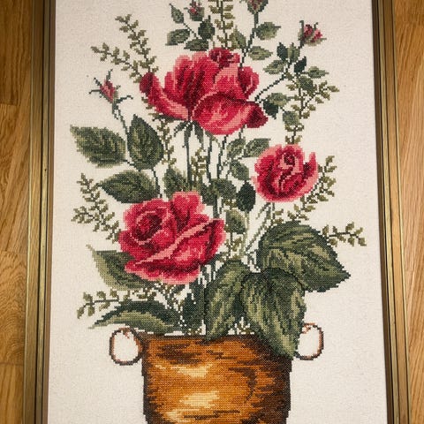 Søkeord: brodering, retro, vintage, cottage core, korssting, håndarbeid, pastell, romantic, naivitet, pynt, dekor, bilder, kunst, håndverk, hjemmelaget, tre, sjarmerende, gammeldags, nostalgi, bildevegg, trendy, trend, gallery wall, unik, spesielt, kugal