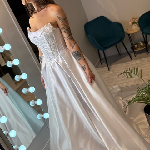 Kjolen er kun brukt en gang. Den har noen få bruksmerker nederst på slepet, se vedlagt bilde.