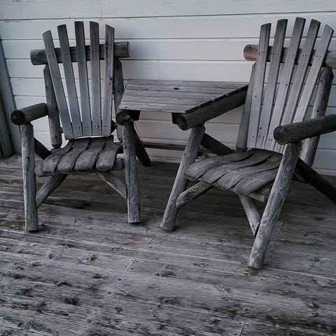 Utemøbelsett i rotting bestående av to lenestoler, et bord og en parasoll. Settet inkluderer puter i beige farge. Passer for utendørs bruk på terrasse eller balkong.