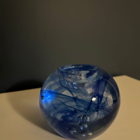 Kosta Boda telysholder i hvitt. Laget av glass med et mønster av virvler. Passer som dekorativ gjenstand i hjem eller kontor. 100,-