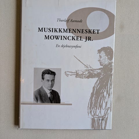 Selger et pent eksemplar av Thorlief Almes bok Musikkmennesket Mowinckel Jr. – en varm og innsiktsfull biografi om komponisten, pianisten og musikeren Harald Mowinckel jr., en sentral skikkelse i Bergens musikkliv i første halvdel av 1900-tallet.