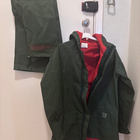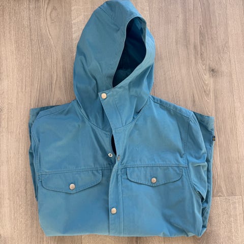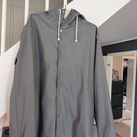 Helly Hansen vintage regnjakke i blå farge, størrelse ca S herre. Jakken har hette med snor, trykknapper foran og lommer. Materialet er vanntett og egnet for utendørs bruk i vått vær. Noe stor i str. står på jakken: Large dame / Small herre.