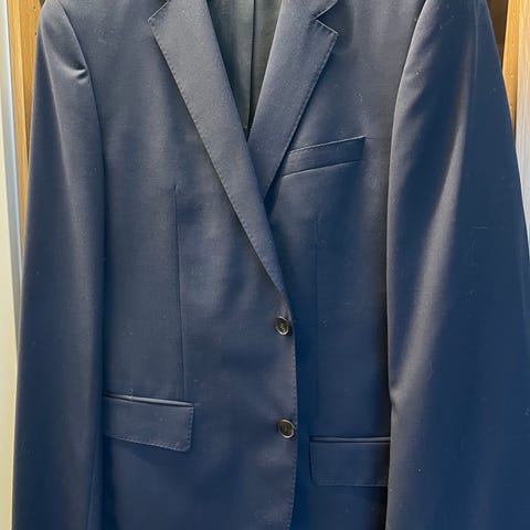 Jeg selger denne svært lite brukte blå dressen fra Dressmann i slimfit str 48, og med tilhørende bukse i slimfit str 30/30. Personen som har hatt den er 174 cm lang og str S/M.